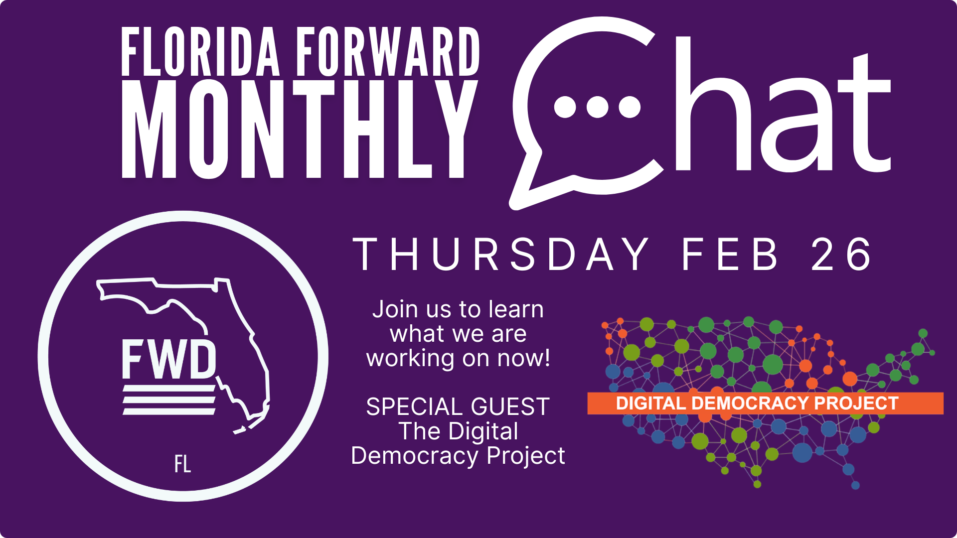 Join us for our next Florida Forward Monthly Chat, where we'll share everything we are working on and how you can help move us FORWARD!